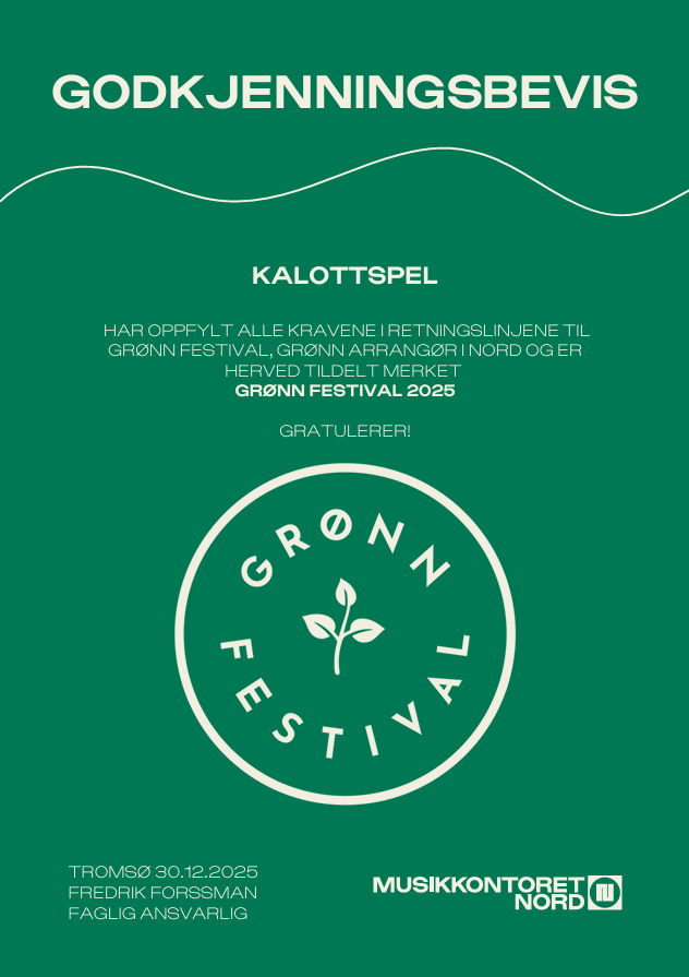 Vi i Kalottspel er stolte over å kunne annonsere at vi er tildelt sertifisering som grønn festival av Musikkontoret Nord.